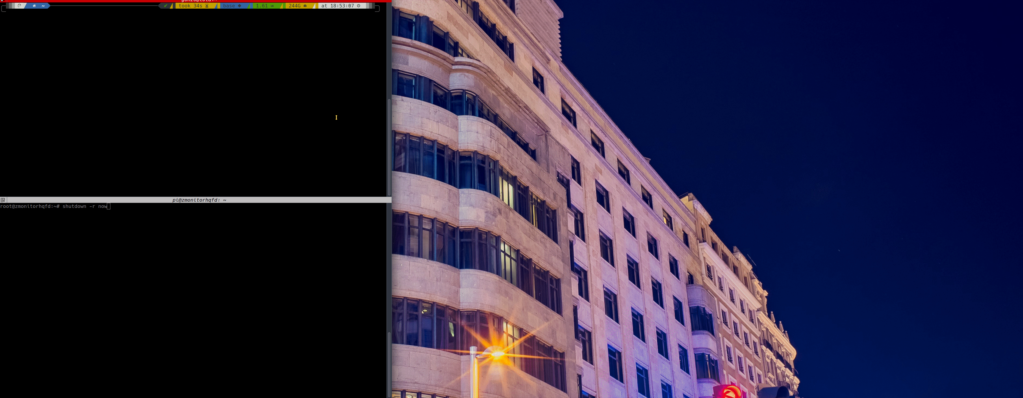 Terminal superior izquierda: Lanzo el comando que abre vlc conectándose a la capturadora la cual tiene conectado un cable HDMI a la salida de video de la Raspberry Pi. Terminal inferior izquierda: Conectada mediante ssh a la Raspberry Pi, la reinicia y se ve el reinicio en le vlc. Ventana de VLC: a la derecha de la pantalla, al pulsar sobre ella Ctrl+q se sale y la consola superior izquierda se libera de nuevo.